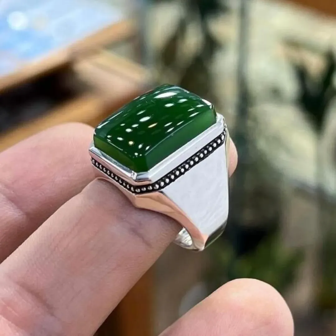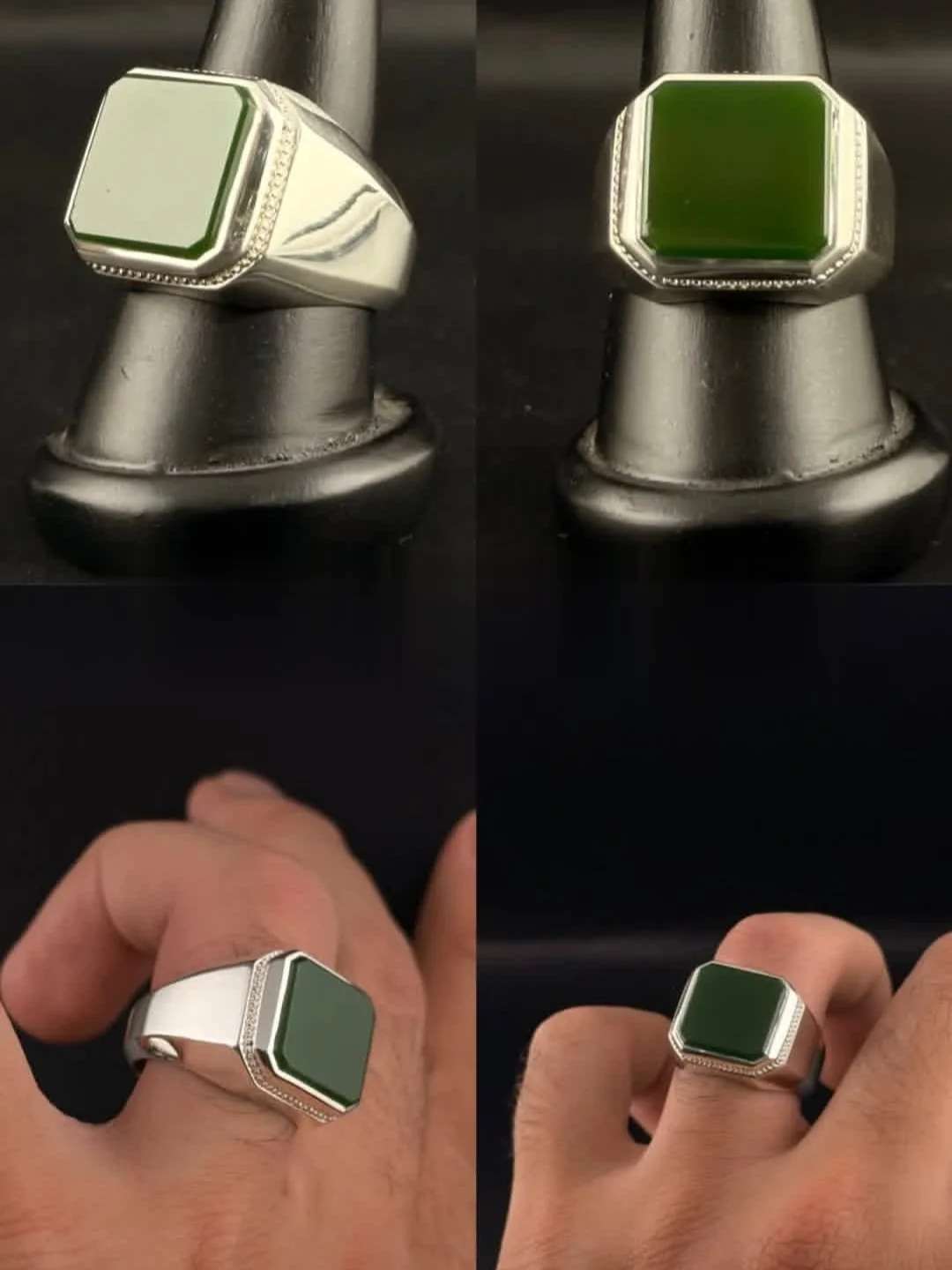 انگشتر نقره مردانه مزین به سنگ عقیق سبز.