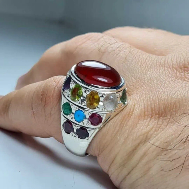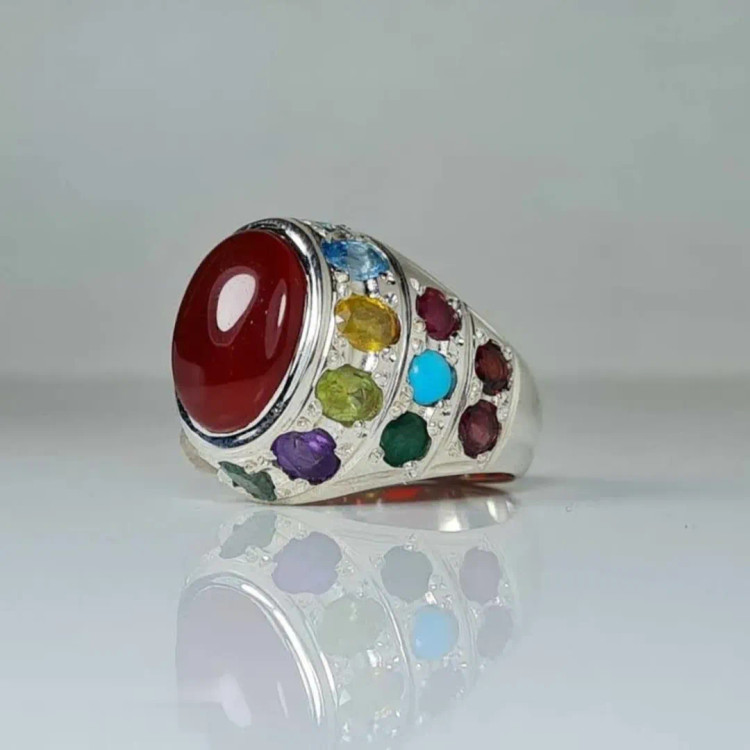 انگشتر نقره مردانه جواهری با سنگ های زمرد ، یاقوت زرد ، سرخ و کبود ، فیروزه ، زبرجد ، دُرّ نجف و گارنت