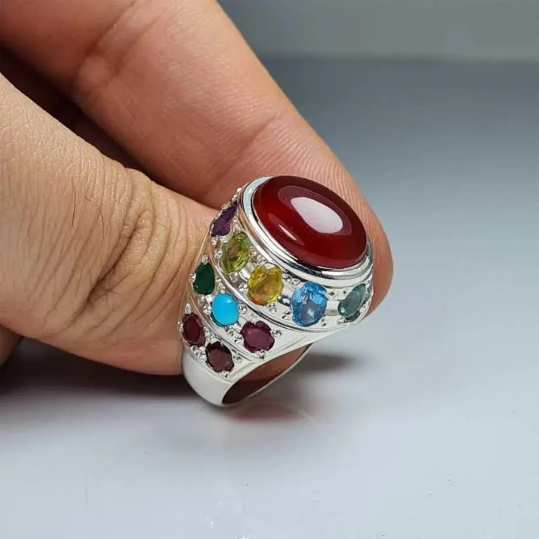 انگشتر نقره مردانه جواهری با سنگ های زمرد ، یاقوت زرد ، سرخ و کبود ، فیروزه ، زبرجد ، دُرّ نجف و گارنت